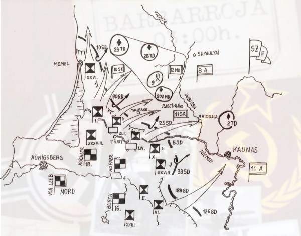 Having in mind the plans of assaulting the Northwestern frontiers of the USSR, von Leeb realizes the orography of the Baltic countries and its features. The terrain characteristics force him to concentrate the main axis of his attack (Schwehrpunkt) over his right flank, starting from East Prussia and following the line Kaunas-Daugavpils (Jakovpils)-Western Dvina river-Pskov lake. By doing so he attemtps a two-fold task: Firstly, attacking in a wedge to split up F. I. Kuznetsov forces and Pavlov‘s (Kiev Special Military District). Secondly, to strangle the most of Kuznetsov forces against the Baltic Sea coast and Gulf of Finland and eventually to drive around the shores of Pskov lake and the Volkhov river towards Leningrad.