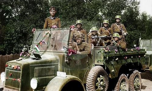 Tras el arbitraje de Viena el 30 de agosto de 1940, Hungría recupera zonas de la Transilvania rumana. Rumanía, por contra, recibirá muy deseadas garantías de defensa de Adolf Hitler. En la ilustración tropas motorizadas húngaras ocupando el nuevo territorio de mayoría racial magiar. La tensión política entre ambos estados crecerá, reservándose Alemania el papel de mediador.