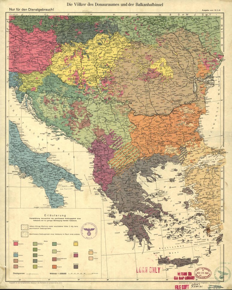 En tinta marrón está representada Rumanía en esta carta de marzo de 1940 antes de la pérdida de territorios a manos de soviéticos, húngaros y Búlgaros. En trazo negro se aprecia el curso del Danubio, que hace de frontera entre algunos estados en varios tramos de su recorrido hasta morir en el Mar Negro. La importancia de esta via fluvial ha tenido siempre un carácter no sólo económico sino también estratégico.