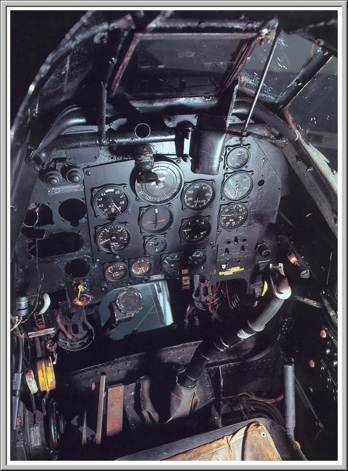 Panel de instrumentos en la cabina del piloto del Ju-87. Entre la palanca de mando y el asiento se encuentra un acristalamiento que permite al piloto adentificar los objetivos justo bajo él.